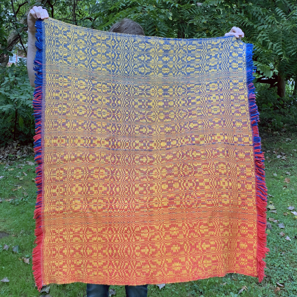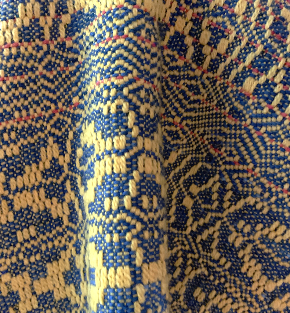 Block Double Weave at 1:3 Ratio; Warp Dominant Layer Woven as Supplemental Warp Floats; Embroidery